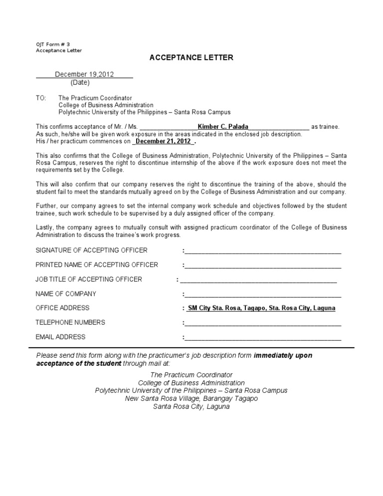 Business letter samples job acceptance. The letter can be sent by email or mail. A job acceptance letter lets you outline the details of the job so that you are clear about your role in the company prior to your joining. Block letter format is the preferred business letter format for job acceptance letters as it is the most professional. Job acceptance letter.
